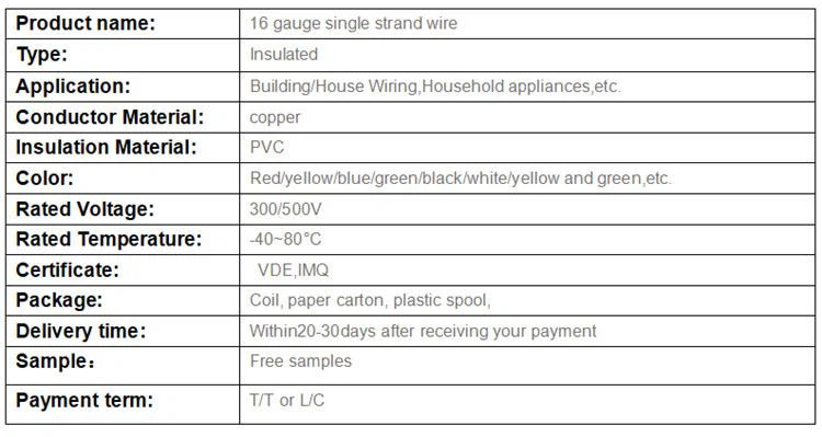 1.16 gauge single strand wire adopts copper core conductor and PVC insulator. These cables are used for building lines of power, lighting and electrical control lines for general purposes. They are suitable for pipeline and fixed and protected installation. The cables can have flame retardant, fire resistance and other properties, which is convenient for installation, operation and maintenance.